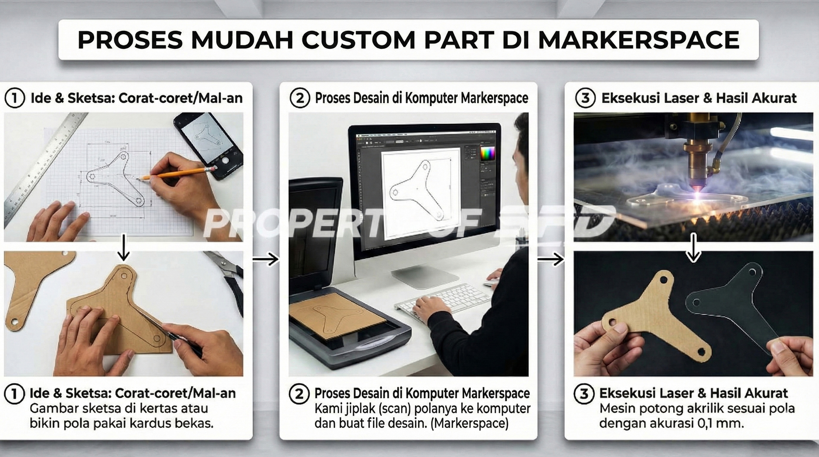 Tapi sekarang zaman udah berubah, Bro! Lo bisa bikin part custom sendiri dengan kualitas setara pabrikan (OEM Look). Rahasianya? Jasa Laser Cut & Grafir di Makerspace.