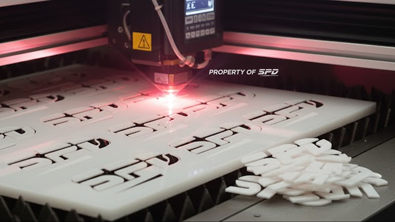 Kenapa Laser? Bisa potong akrilik sesuai bentuk logo rumit apa pun. Grafir permanen, anti-luntur.